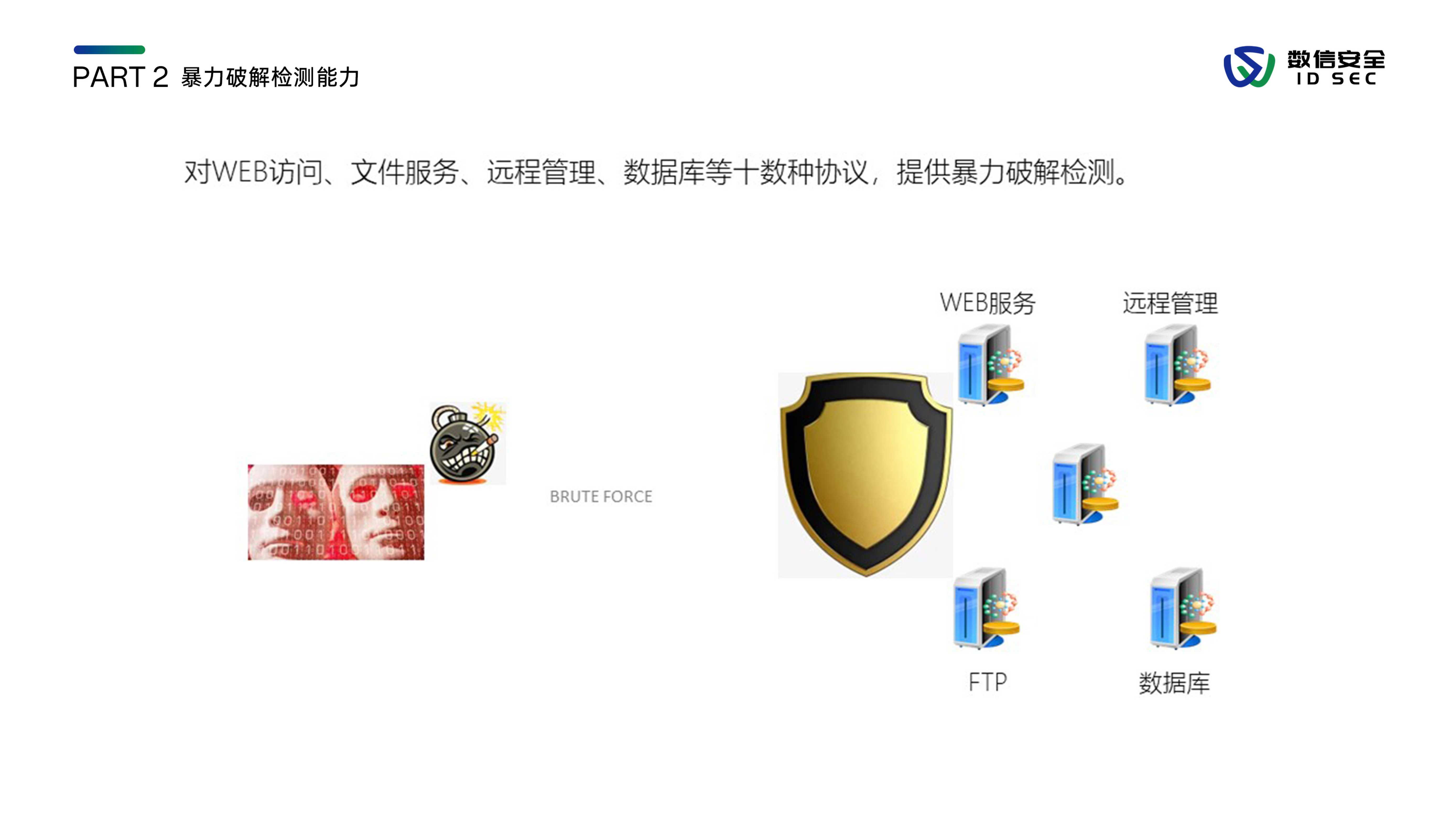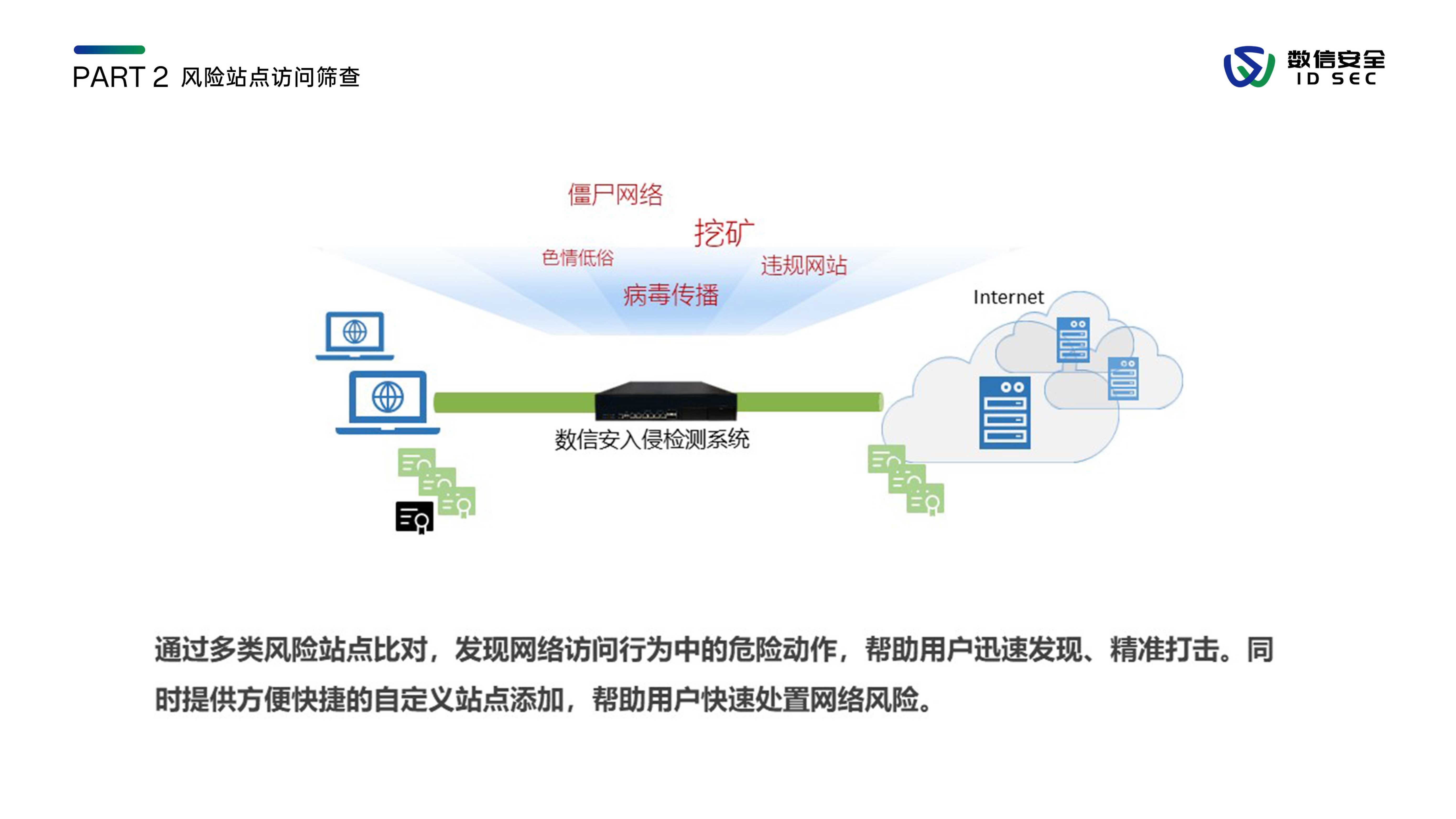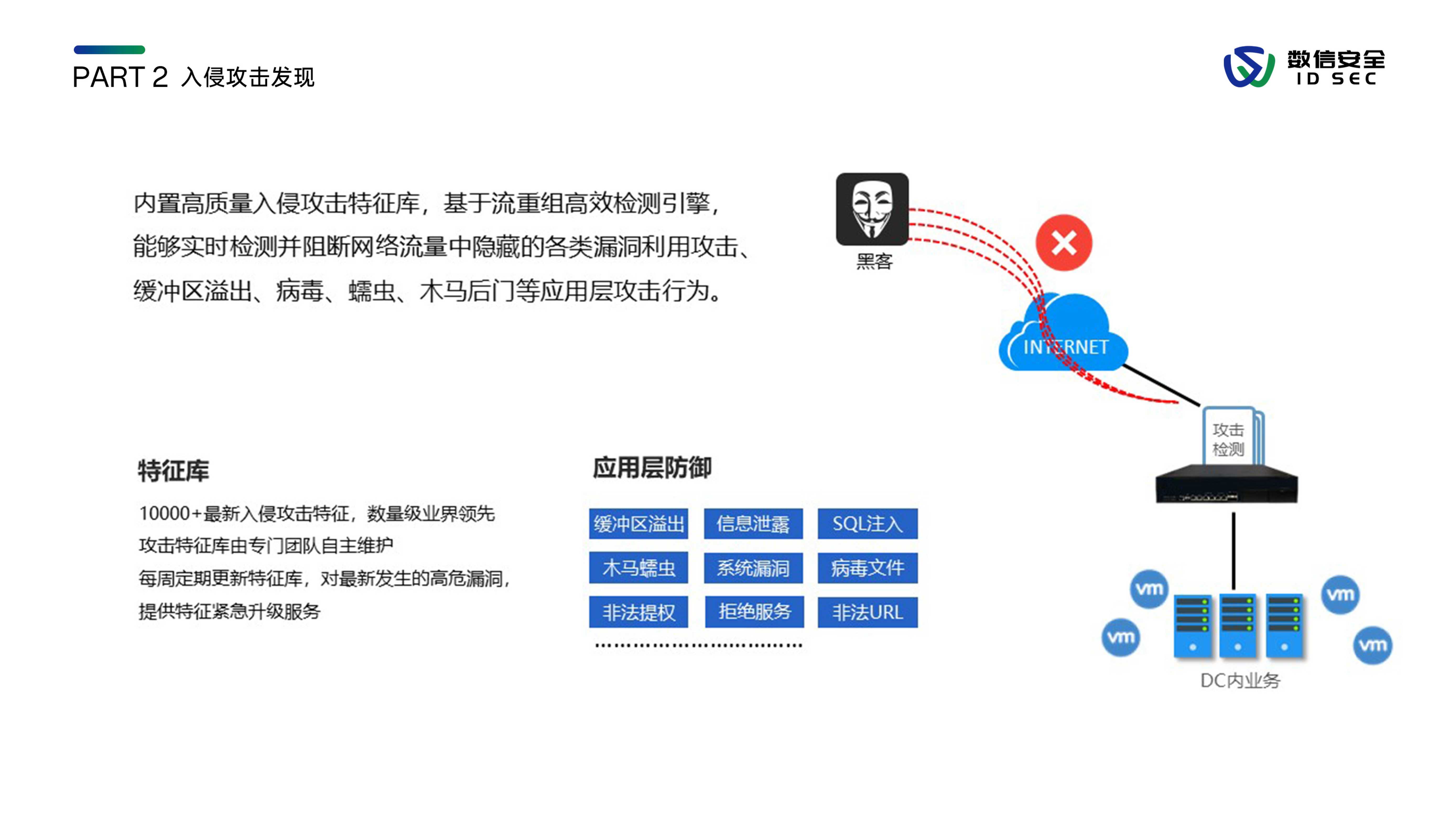 数信安入侵防御系统,是数信安自主研发的新一代入侵防御类安全产品,用来应对新的网络环境中,威胁手段越来越隐蔽、威胁范围覆盖云到端、威胁来源不分内外的新挑战。产品站在全新的用户视角,全面深入到2-7层进行分析和检测,利用流重组及协议状态分析等技术手段,对缓冲区溢出、SQL注入、暴力猜测、DoS攻击、扫描探测、蠕虫病毒、木马后门等各类黑客攻击和恶意流量进行实时阻断及报警,内置特征库数量3000+,检测库11000+,全面兼容CVE/CNCVE,并通过与防火墙联动、发送邮件、SNMP trap等方式进行威胁协同防御或报警。
