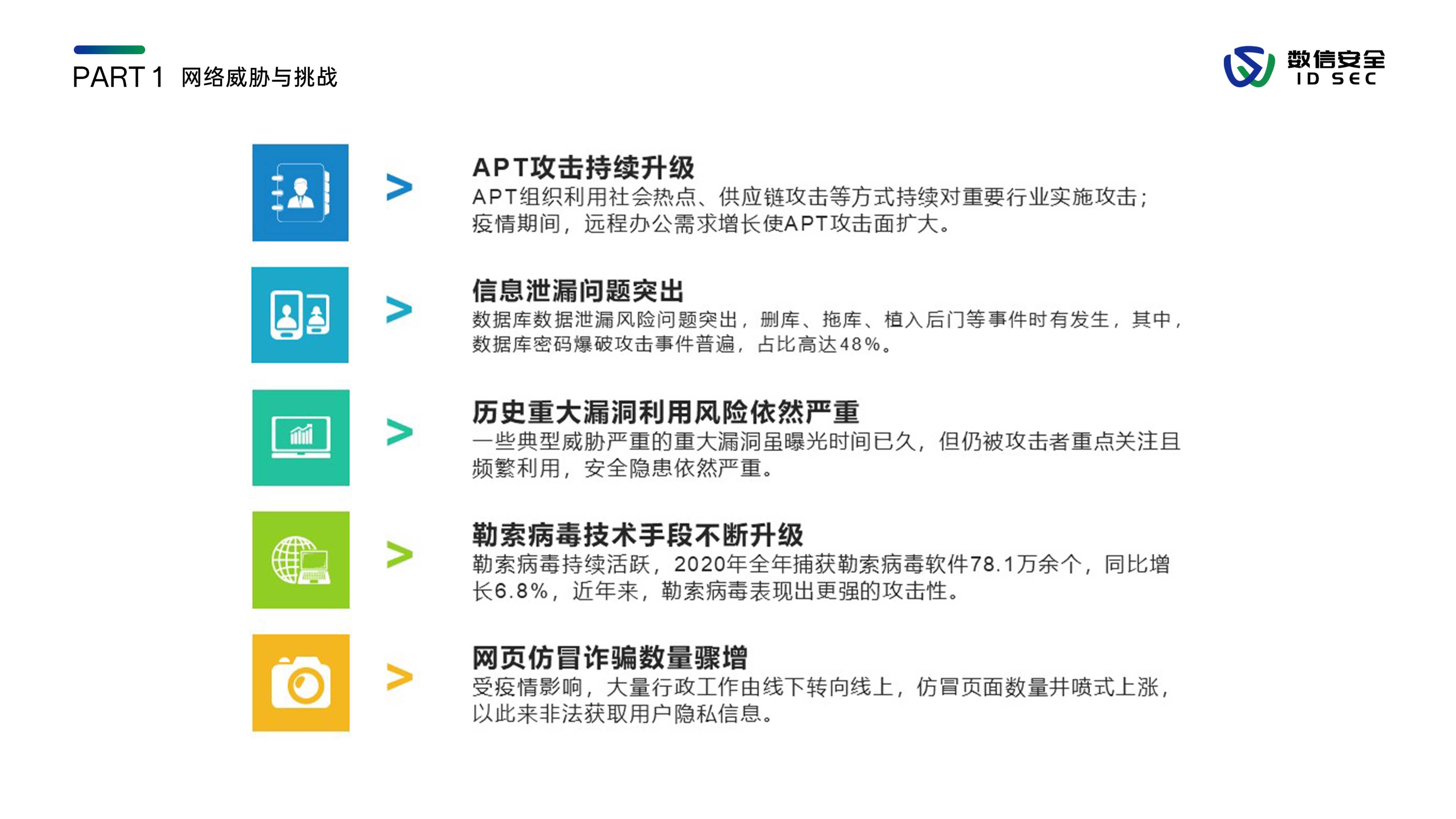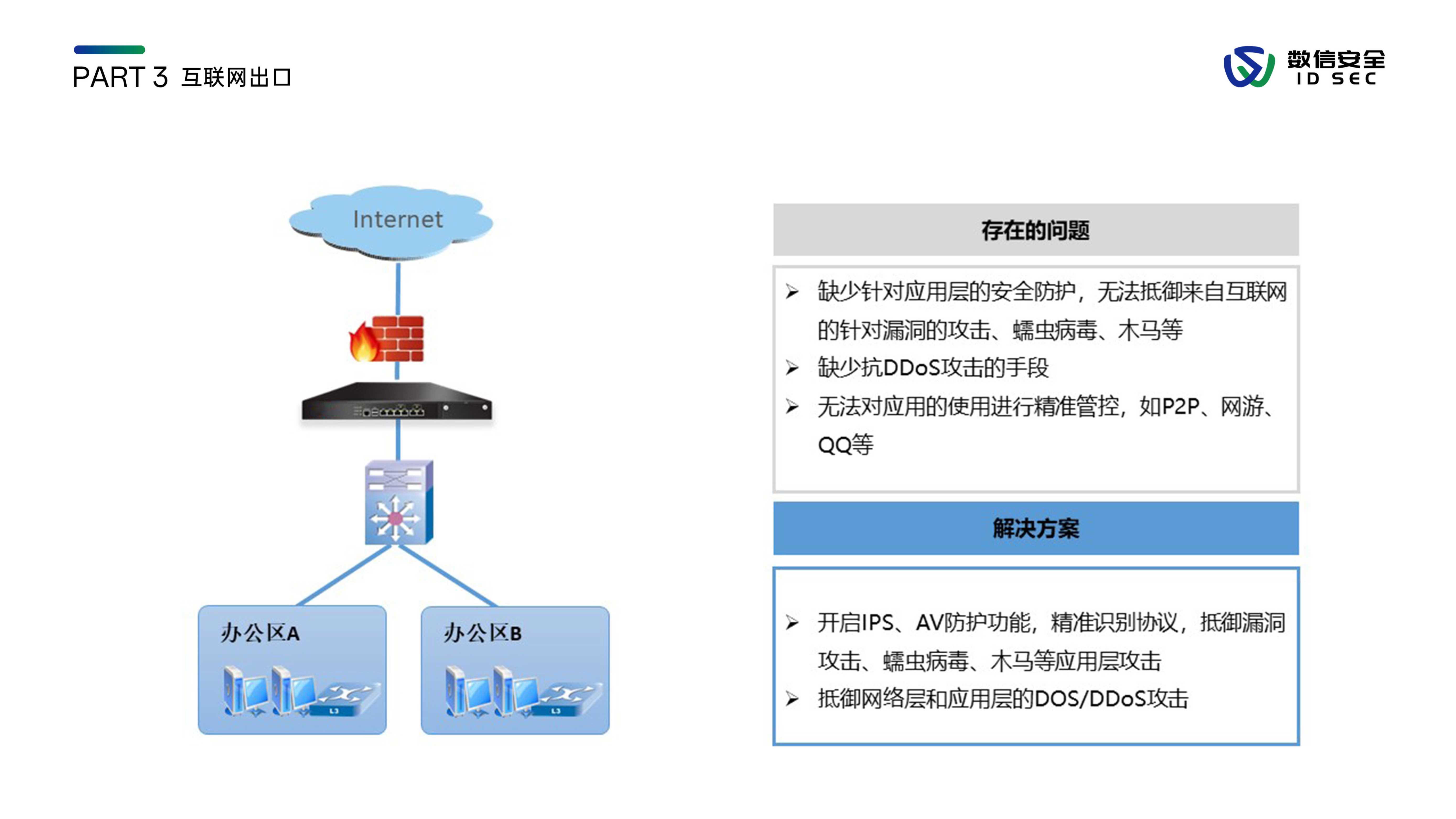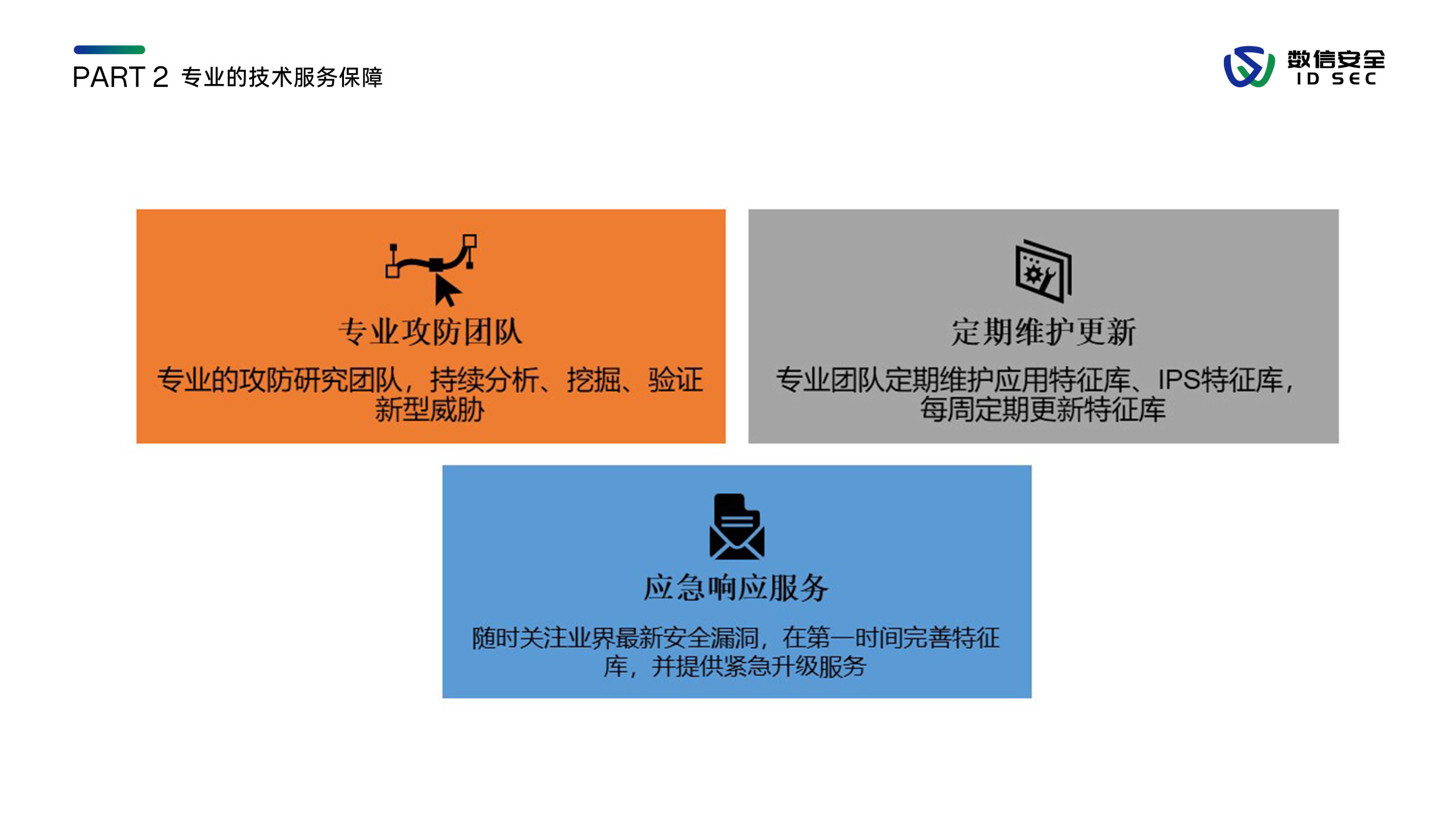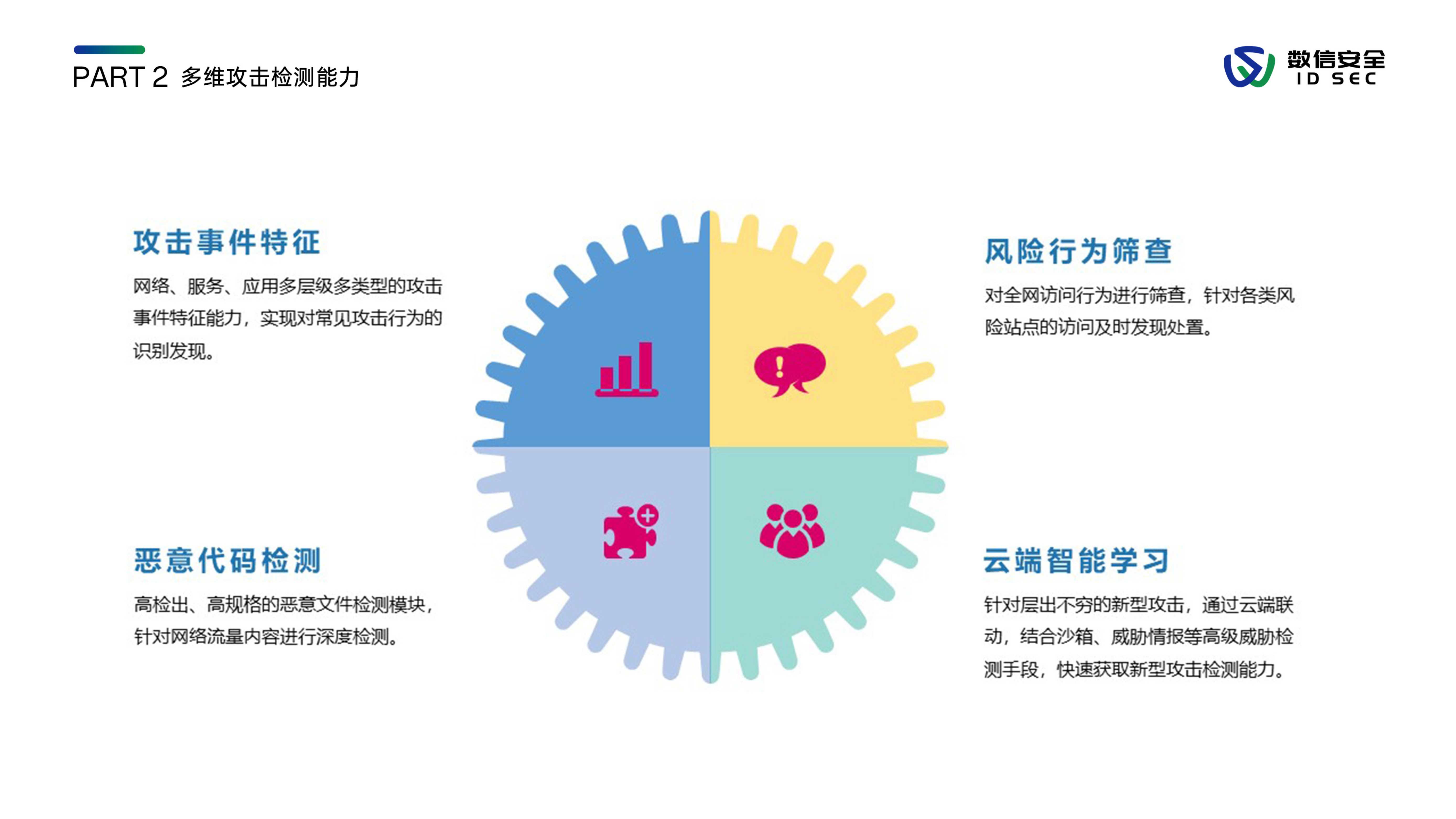 数信安入侵防御系统,是数信安自主研发的新一代入侵防御类安全产品,用来应对新的网络环境中,威胁手段越来越隐蔽、威胁范围覆盖云到端、威胁来源不分内外的新挑战。产品站在全新的用户视角,全面深入到2-7层进行分析和检测,利用流重组及协议状态分析等技术手段,对缓冲区溢出、SQL注入、暴力猜测、DoS攻击、扫描探测、蠕虫病毒、木马后门等各类黑客攻击和恶意流量进行实时阻断及报警,内置特征库数量3000+,检测库11000+,全面兼容CVE/CNCVE,并通过与防火墙联动、发送邮件、SNMP trap等方式进行威胁协同防御或报警。